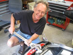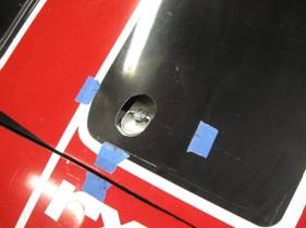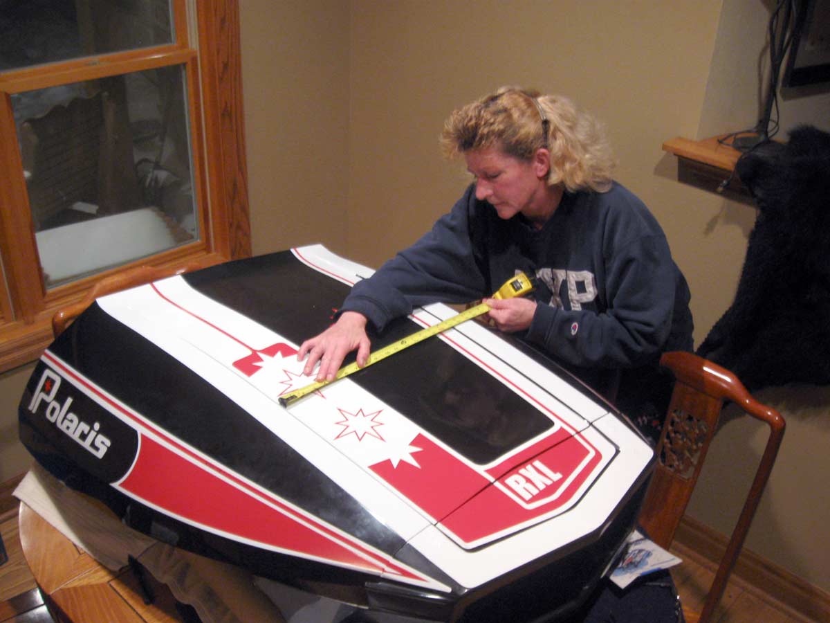 At this point we are in the middle of fine tuning the RXL graphics. It's not an easy task. We had to adapt the RXL theme to the precise shape of my RXL hood and nose. The various parts of this sticker package are keyed to the mold lines in the hood. Here Cece, my long time sign gal, is in round two of the fine tune process.