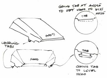 It was smart for us to mold two long tabs on the forward edge of the hood. These are deeper than they need be for a reason. The idea is that by grinding way on these tabs you will be able to lower the hood position on a level with the nose. I suspect that grinding will also wind up angled so the hood is able to move forward to kiss fit the nose. Here is visually what I'm talkin' about.
