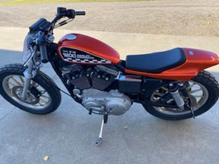 This started as a nice low mileage 2001 Sportster Sport. I stripped it down and sold the sheet metal, instruments, headlight and turn signals. Even found a buyer for the stock exhaust, can you imagine ! I purchased another front wheel and prepped and painted both as outlined on your website, got one of your adaptors for mounting on the rear and installed Shinko dirt track tires. The exhaust used was Cone as you suggested, very nice piece and pried reasonably.